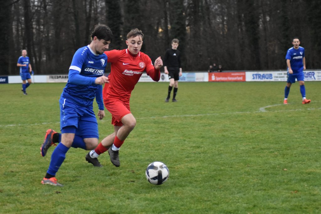 Richtig enttäuschend verlief das Vorspiel für die Hausherren, per Kopfball hatte Lars Plutz ebenfalls schon früh das 1:0 erzielt (6.), weitere Möglichkeiten wurden liegen gelassen. Insgesamt erwies sich dann der Tabellenletzte sogar als cleverer und spielfreudiger und kratzte gleich mehrfach am Ausgleich, den dann der eingewechselte Moritz Rettig fünf Minuten vor dem Spielende völlig verdient besorgte.